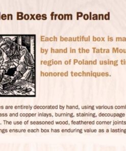 This beautiful box is made of seasoned Linden wood, from the Tatra Mountain region of Poland. The skilled artisans of this region employ centuries old traditions and meticulous hand craftsmanship to create a finished product of uncompromising quality. The use of feathered corner joints and raised interior lining ensure its enduring value as a lasting keepsake. These boxes are entirely decorated by hand, using various combinations of carving, brass and copper inlays, burning, and staining techniques. Once bestowed upon royal families throughout Europe as an elegant and exclusive gift, these boxes were used to hold timeless treasures. Then as now, each box is entirely handcrafted, is a unique masterpiece, and is exclusive in its detail and individual character. The Tatra Mountain lore adds a mystique to each box, that combines with the premier craftsmanship to bring years of pleasure to the owner.