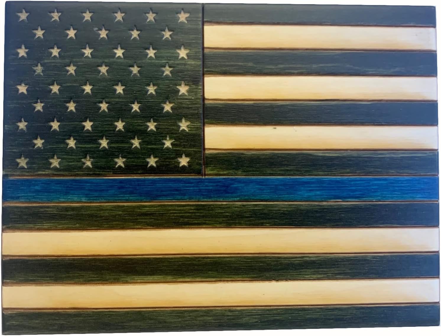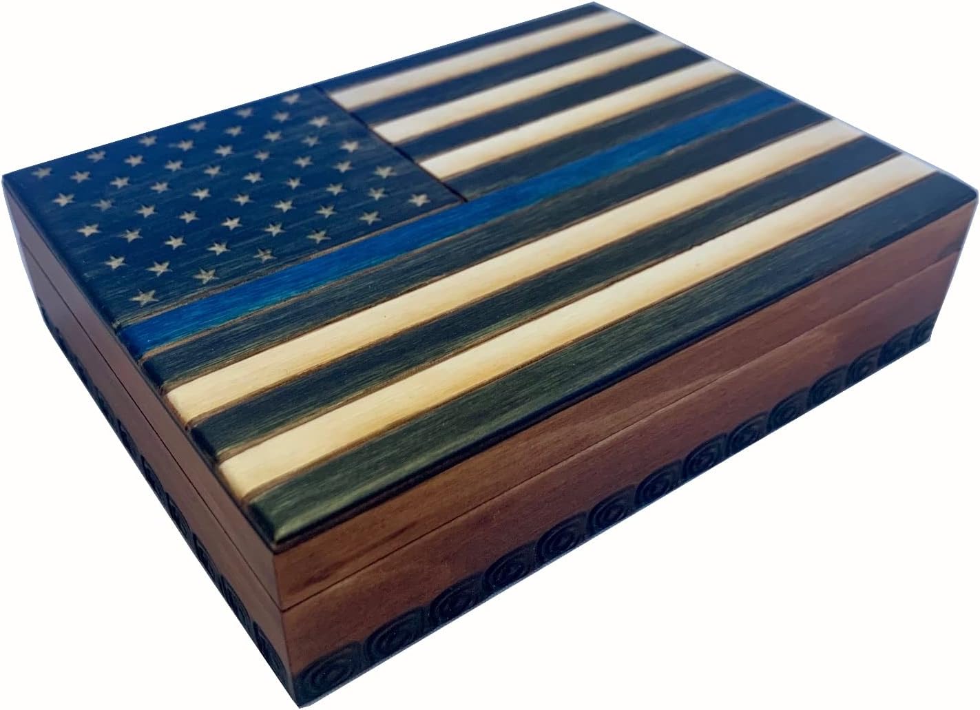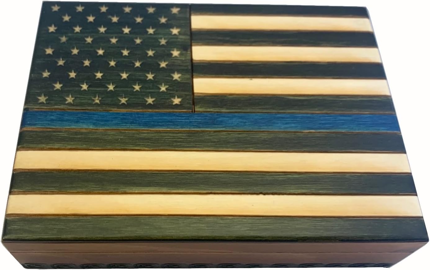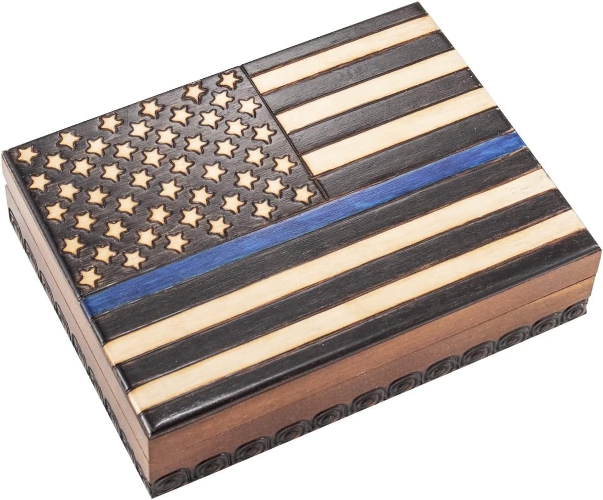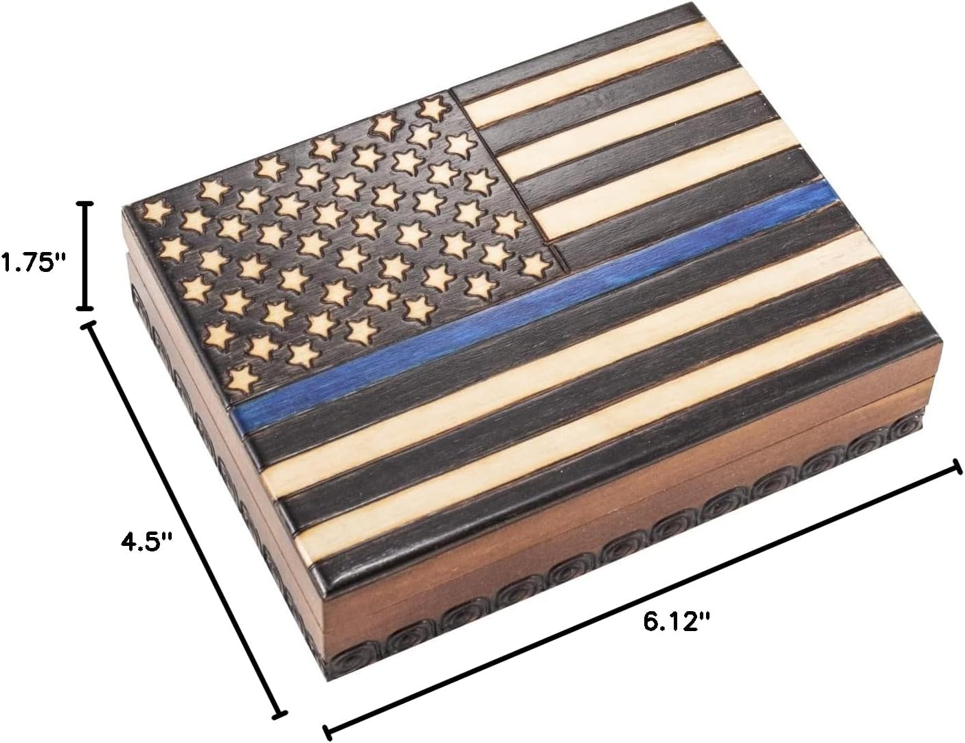 - Handmade US AMERICAN FLAG w/ Blue Stripe wood box. Dimensions: 6-1/8 in. x 4-1/2 in. x 1-3/4 in. Handmade in the Tatra Mountain region of Poland.